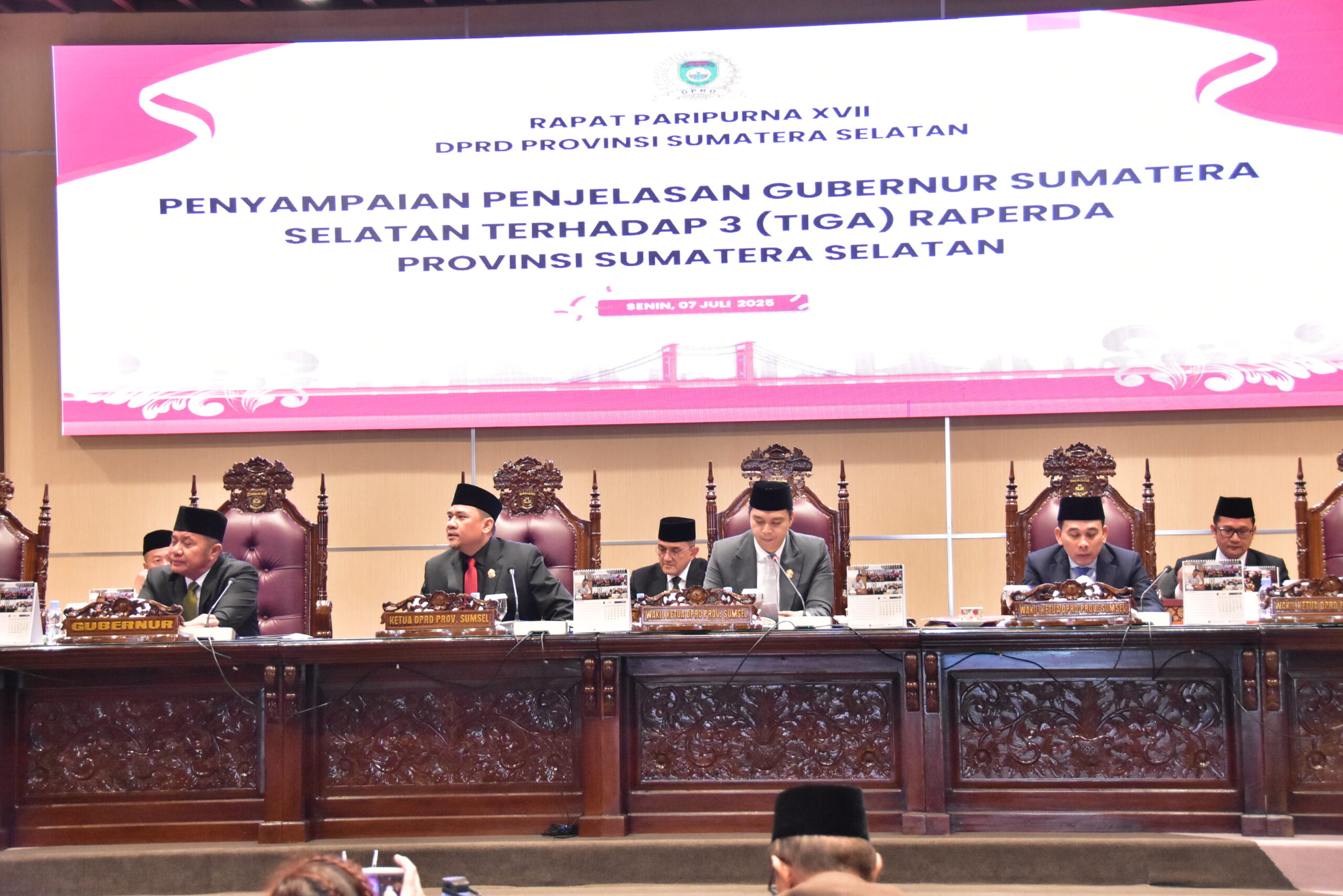 DPRD Prov. Sumsel dengarkan Penjelasan Gubernur Sumatera Selatan terhadap 3 (Tiga) Rancangan peraturan daerah (Raperda) Prov. Sumsel pada Rapat Paripurna XVII (17) hari ini Senin, 7/725. Rapat Paripurna dipimpin oleh Wakil Ketua DPRD Prov.Sumsel Raden Gempita, SH didampingi oleh Ketua DPRD Prov.Sumsel; Andie Dinialdie, SE, MM dan Wakil Ketua DPRD Prov.Sumsel; H. Nopianto, S.Sos, MM, dihadiri oleh Gubernur Sumsel H. Herman Deru, SH, MM, dan Sekretaris Daerah; Drs. H. Edward Chandra, MH, Sekretaris DPRD; H. Aprizal, S.Ag, SE, M.Si, unsur FORKOPIMDA, Para Kepala Dinas serta perwakilan Organisasi Perangkat Daerah (OPD) di lingkungan Pemerintah Provinsi Sumatera Selatan serta tamu undangan lainnya.